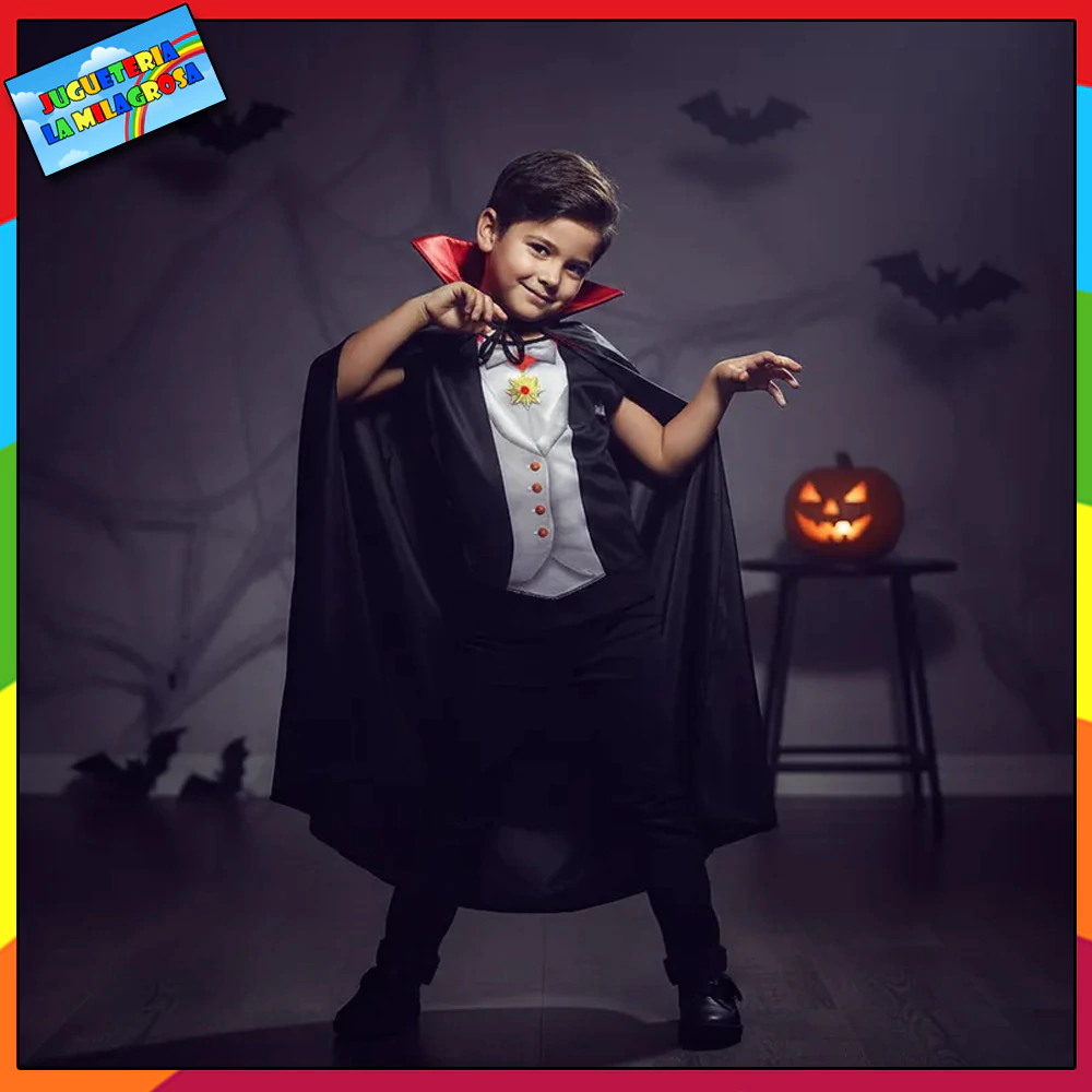 Disfraz de dracula para niños. Conformado por una pechera estampada y una capa negra con cuello rojo.